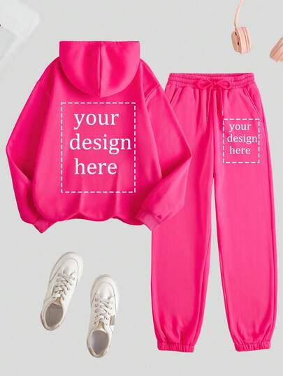 2 piezas Conjunto de sudadera con capucha + pantalón de chándal, regalo personalizado de Acción de Gracias, regalo de Navidad - Sudadera deportiva personalizada para mujer, agrega tu propio texto/imagen (diseño de insignia/logotipo de empresa/foto familiar/selfie) - Rosa Fucsia - Añade 2