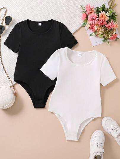 Set de 2 piezas de body casual de manga corta y cuello redondo de unicolor para niñas preadolescentes - Multicolor - Añade 2