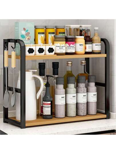 2-Tier Carbon Steel Spice Rack Organizer With Wooden Accents For Kitchen Countertop, Space-Saving Kitchen Shelf Organizer With Hooks For Coffee Bars & Organizing Cooking Essentials - Negro - Añade 7