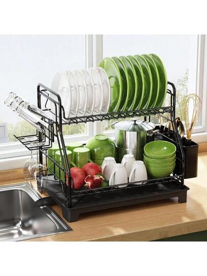2 Tier Dish Drying Rack, Stainless Steel Dish Drainer With Drip Tray, Sink Drainer Rack With Swivel Spout, Utensil Holder, Automatic Drain Draining Board For Kitchen Sink - Negro - Añade 1