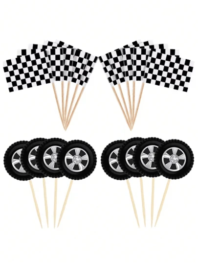 20/24 piezas Bandera de decoración de pastel con escena de , decoración de pastel con temática de con bandera a cuadros en blanco y negro para fiesta temática de carreras, suministros para fiesta, tarjetas de postre para mesa de cumpleaños - Multicolor - Añade 4