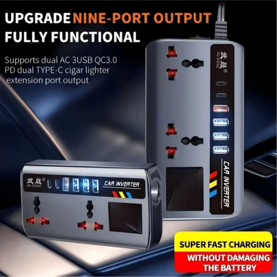 Inversor de corriente para coche de 200W DC 12V/24V con 4 puertos USB y 2 puertos Tipo-C, adecuado para coches, SUV y viajes por carretera, se enchufa al encendedor de cigarrillos del coche - Multicolor - Añade 7