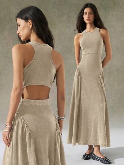 LYSMO Vestido largo de verano para mujer con lavado desgastado en color caqui, diseño de espalda de tirantes, nuevo lanzamiento 2025 - Caqui - Añade 4
