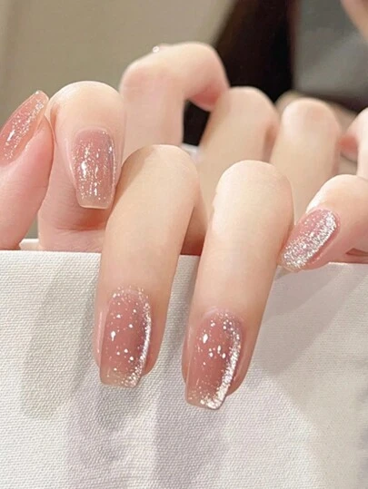 24 piezas/set Puntas de uñas postizas con diseño de cabeza plana, uñas de ojo de gato con brillo rosa, uñas postizas, suministros para uñas - Rosa - Añade 1