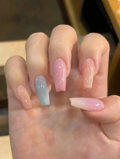 24 Piezas/set Uñas Postizas Con Forma De Ataúd Poco Profundo Y Degradado, De Longitud Media A Larga Para Fiesta, Incluye Pegamento Para Uñas Y Lima Para Uñas - Multicolor - Añade 1