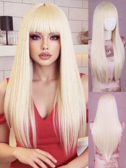 Peluca larga y recta de 26 pulgadas para mujer, color beige con flequillo, adecuada para uso diario, fiestas y días festivos - Multicolor - Añade 1