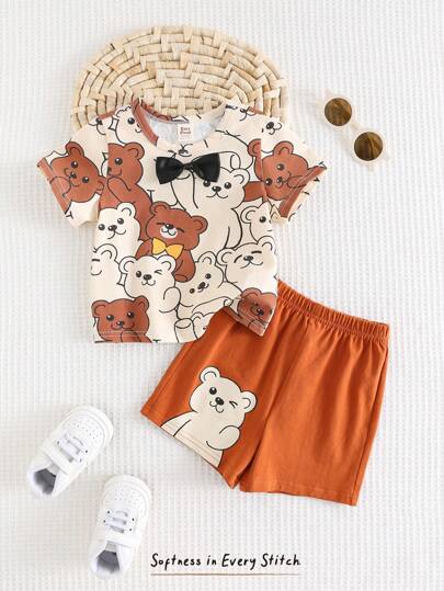 Cozy Pixies Conjunto de 2 piezas de Top de manga corta de cuello redondo suave con patrón de animal de dibujos animados y pantalones cortos de cintura elástica para bebé niño - Multicolor - Añade 1