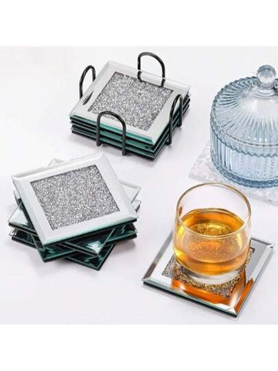 2 Piezas Posavasos De Cristal Con Llenado De Diamantes Simples Y Superficie De Espejo, 2 Cuadrados Y 2 Redondos, Adecuados Para Uso Diario En El Hogar O Decoración De Fiestas - Plateado - Añade 6