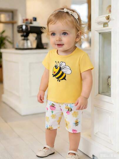 Conjunto de 2 piezas de top de manga corta con estampado de abeja lindo + shorts con estampado de flores y abejas, para uso casual de verano - Amarillo - Añade 2