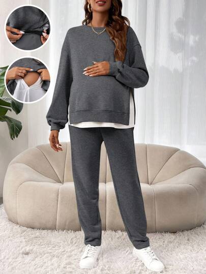 SHEIN 2 piezas Sudadera de manga larga raglan de abertura y pantalones con cintura ajustable para maternidad, conjunto para otoño - Gris Oscuro - Añade 1