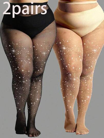 2 piezas Medias de rejilla con adornos de strass para mujer de talla grande, leggings ajustados brillantes para clubes nocturnos, moda gótica, versátiles para todas las estaciones - Multicolor - Añade 16