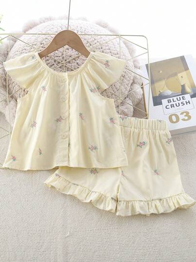 Set de 2 piezas de top sin mangas con bordado floral dulce y pantalones casuales para niñas, verano - Albaricoque - Añade 2