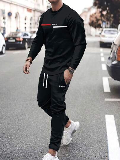 2 piezas/Set de sudadera de cuello redondo y pantalón de chándal casual de tela premium con degradado, conjunto superventas para hombres - Negro - Añade 2