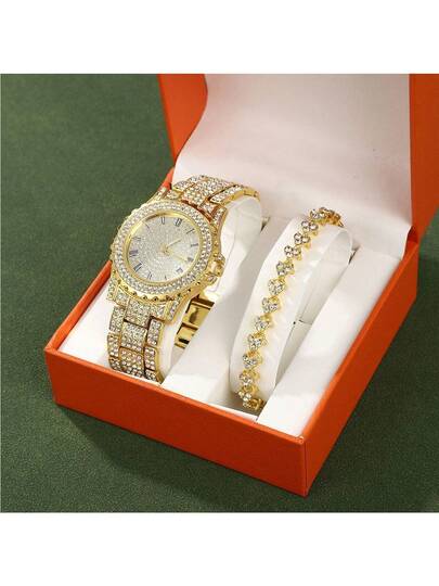 2 piezas Set de mujeres aleación de aluminio gota de agua con diamante de imitación Reloj con pulsera combinación con patrón esfera , Iluminación puntero con diariamente Decoración ( Caja no incluido ) - Dorado - Añade 3