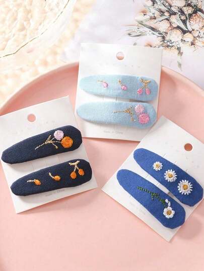 Set de 2 pinzas para el cabello de mujer con bordado floral y cereza en tela azul, accesorios de cabello minimalistas, versátiles y lindos - Multicolor - Añade 6
