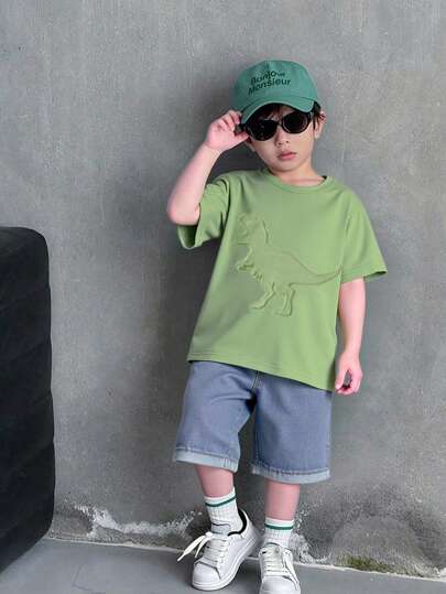 Set de 2 pantalones cortos de mezclilla con relieve 3D de dinosaurio para niños pequeños - Multicolor - Añade 3