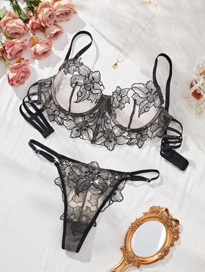 Esselle 2 piezas Conjunto de lencería sexy de color piel para mujeres - Negro - Añade 3