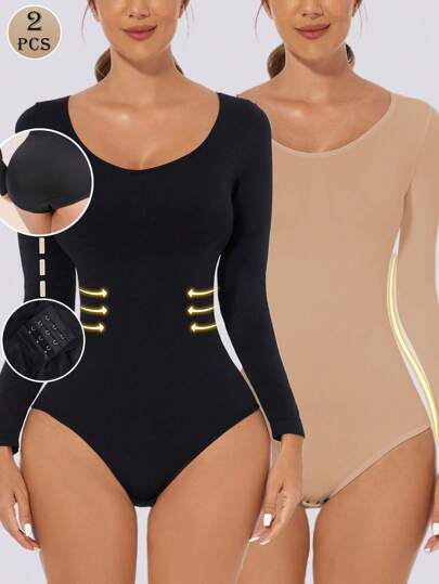 2 piezas Body de manga larga para mujer, control de abdomen, sin costuras, para uso diario casual - Multicolor - Añade 1