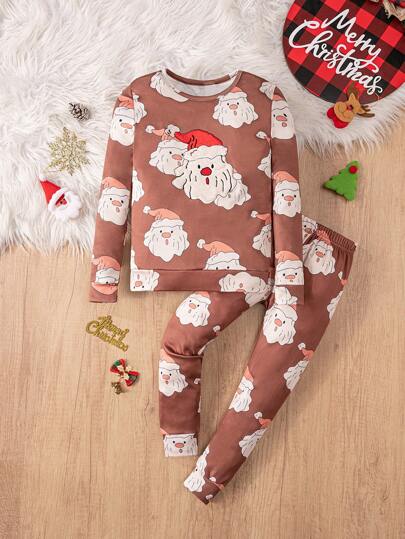 Set de 2 piezas de pijama de ajuste ceñido con estampado de Papá Noel de manga larga para niño pequeño - Marrón - Añade 1