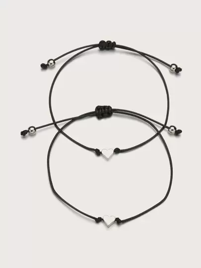 2 piezas Pulseras de amistad trenzadas con soga de cera y forma de corazón de aleación de zinc, adecuado como regalo del Día de la Madre - Negro - Añade 1