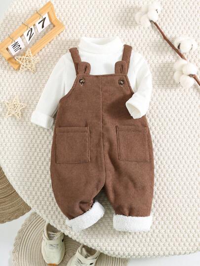 SHEIN Leap Crew Set de 2 piezas para bebé niño/niña, top informal adorable de cuello alto simulado + pantalón tipo peto de unicolor con diseño de orejas 3D - Marrón - Añade 2