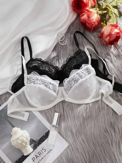 SHEIN Conjunto de sujetador y ropa interior de encaje de contraste para mujeres (juego de 2 piezas) - Multicolor - Añade 1