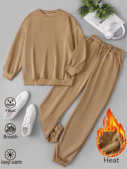 Chiquease Set de 2 piezas de pantalones de chándal con forro térmico y sudadera para mujer - Caqui - Añade 1