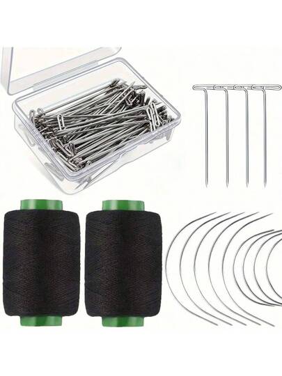 Juego de 32 piezas/21 piezas de agujas de coser y juego de hilos profesionales para pelucas, agujas curvas en forma de C y clips en forma de T para pelucas, con 2 piezas/1 pieza de carrete de hilo de coser, para fabricación, reparación y manualidades de pelucas y extensiones de cabello. - Negro - Añade 3