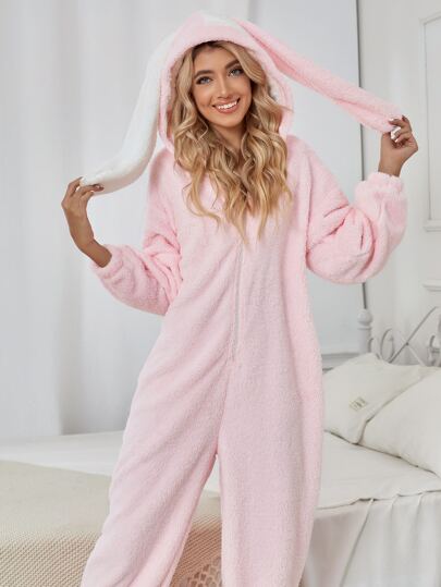 Mono de dormir con diseño de oreja 3D con capucha teddy - Rosa Pálido - Añade 3