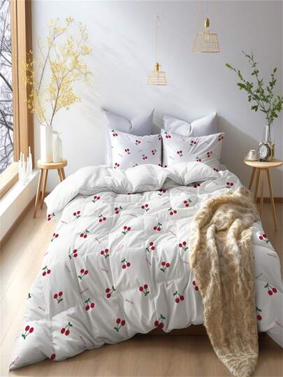 3 Piezas Conjunto De Funda Nórdica Cómoda Y Cálida Con Patrón De Cereza, Adecuado Para Dormitorio, Habitación De Huéspedes - Rojo y blanco - Añade 1