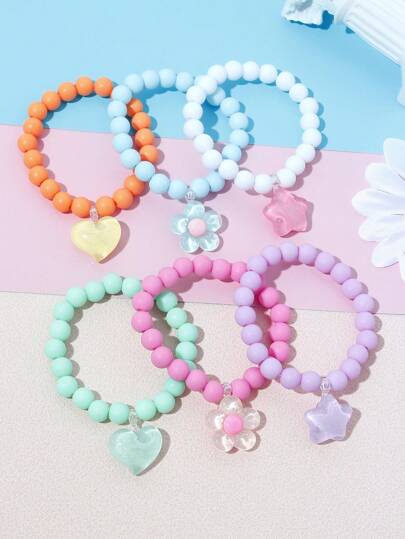 Set de 3 pulseras para niñas con encantos de cuentas, corazones, flores y estrellas - Conjunto de tres piezas - Añade 5