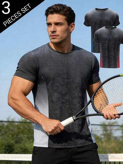 Conjunto de 3 camisetas de compresión de cuello redondo de verano para hombre, de secado rápido y degradado: camisetas deportivas ligeras para gimnasio, actividades en la playa y entrenamiento intenso - Multicolor - Añade 3