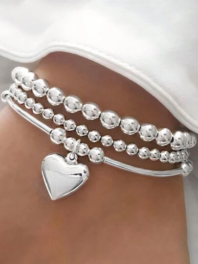 Set de 3 pulseras con cuentas con forma de corazón simple para mujeres, adecuado para vacaciones, citas, regalo de Navidad, uso diario de San Valentín - Plateado - Añade 4