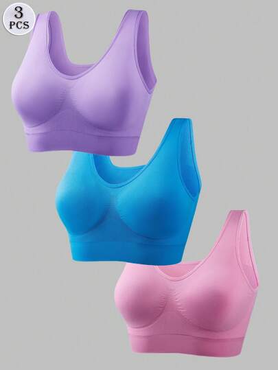 Set de 3 sujetadores deportivos para mujer de talla grande, sujetador deportivo sin costuras y sin relleno de unicolor y multifuncional - Multicolor - Añade 1