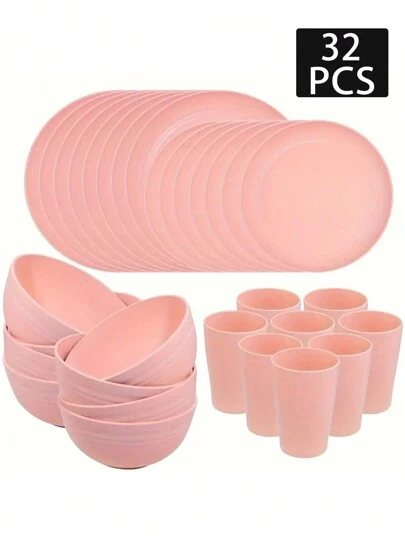 Set de 4/16/32 piezas de vajilla gris de plástico reutilizable, que incluye platos, tazones y tazas, adecuado para el hogar, exteriores, fiestas y picnics, cocina, regalo de Navidad - Rosa - Añade 8
