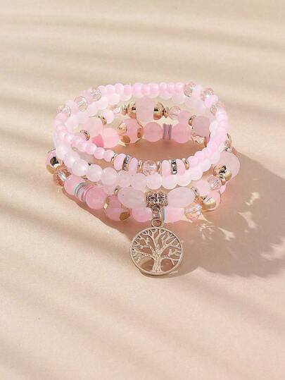 Juego de 4 pulseras de cristal con diseño de árbol de la vida, cuentas de cristal y estilo bohemio - Rosa - Añade 3