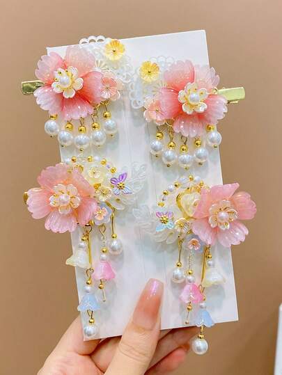 4 piezas Clips de pelo con flores vintage y borlas para niñas - Rosa - Añade 3