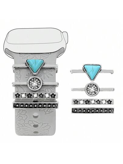 4 piezas Nuevos anillos decorativos para correa de reloj de mujer, tonos de plata antigua con turquesa en formas redonda y triangular, aptos para correas - Multicolor - Añade 5