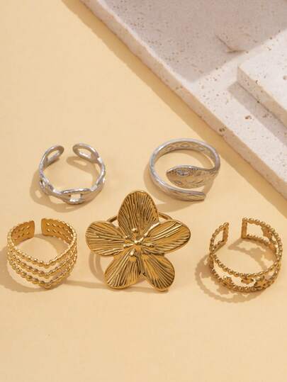 Set de 5 anillos de acero inoxidable vintage personalizados, con diseños de flor 3D, serpiente, bola hueca y estrella, ajustables e hipoalergénicos, adecuados para mujeres, ideales para Pascua, Día de la Madre, uso diario, fiestas y regalos festivos
