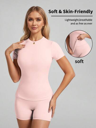 6pecil Camiseta de mujer de unicolor minimalista con cuello redondo y manga corta, estilo de verano color rosa claro