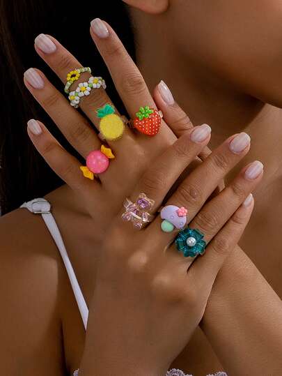 Set de 8 anillos de resina con diseño de flores, piñas y fresas en estilo fresco y elegante para mujer - Multicolor - Añade 5