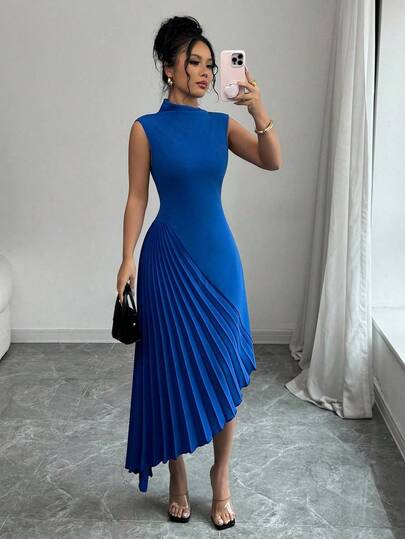 Elenzga Vestido elegante y estiloso para mujer, ideal para uso casual, trabajo o vacaciones, sin mangas, con cuello asimétrico, ajuste en la cintura, bajo asimétrico con pliegues, patchwork de unicolor - azul real - Añade 5