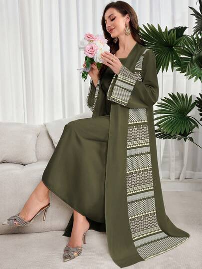 Al Najma Abaya de mujer con estampado geométrico y mangas acampanadas, adecuada para uso diario - Blanco - Añade 1