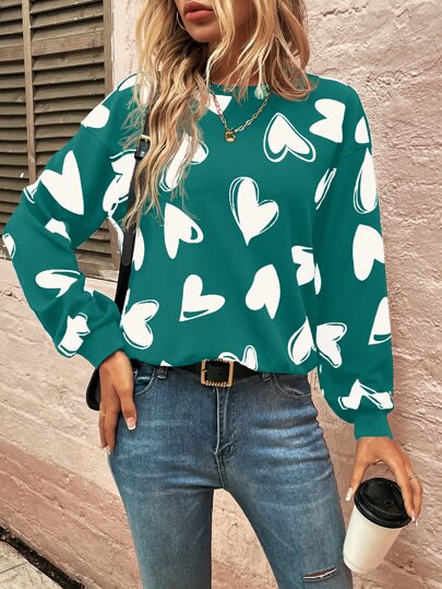 SHEIN LUNE Sudadera con estampado de corazón de hombros caídos - Verde - Añade 5