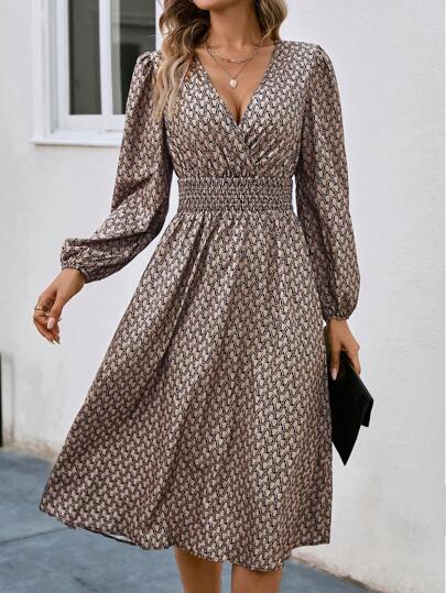 SHEIN Clasi Vestido con estampado de cuello cruzado de manga farol - Caqui - Añade 5