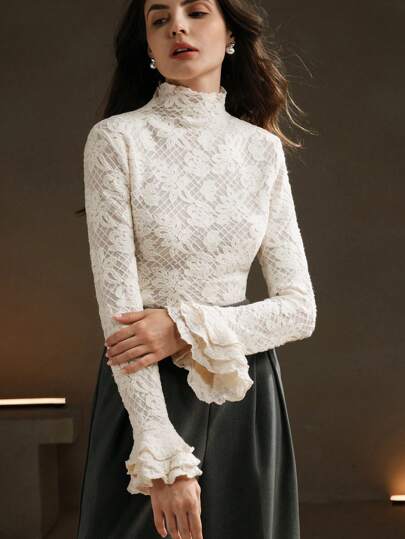 Anewsta Blusa de crochet ajustada con cuello de tortuga, puños con volantes asimétricos - Albaricoque - Añade 1