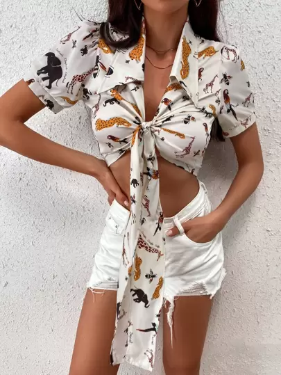 SHEIN Unity Top De Manga Abullonada Con Estampado Animal Y Lazo En La Parte Delantera - Beis - Añade 6