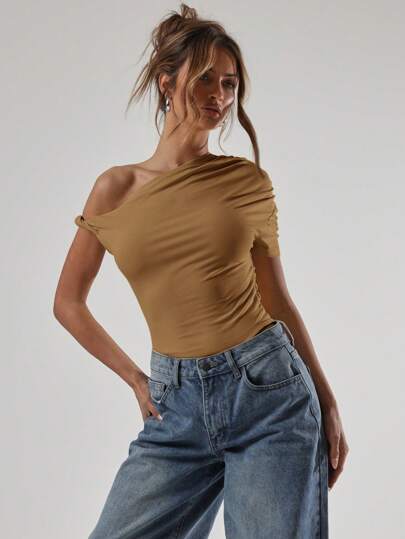 MUSERA Body asimétrico con cuello retorcido, informal, para primavera, verano, vacaciones y festivales - Marrón - Añade 6