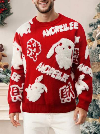 Jersey casual de hombre con estampado de conejo y letras, de caída de hombros, para otoño/invierno - Rojo - Añade 1