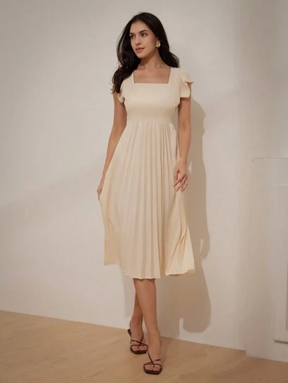 Aveloria Modichic Vestido de Body ceñido de unicolor, estilo francés, elegante, de cuello cuadrado, sin mangas, con bajo plisado en contraste - Albaricoque - Añade 1